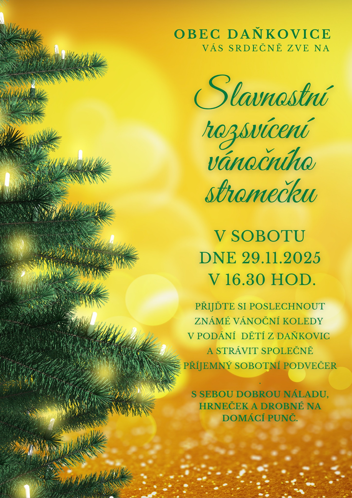 Obec Daňkovice vás srdečně zve na rozsvícení vánočního stromu v Daňkovicích dne 29.11.2025 v 16.30 u autobusové zastávky. Přijďte si poslechnout vánoční koledy a společně si užít příjemný sobotní podvečer u hrníčku domácího punče.