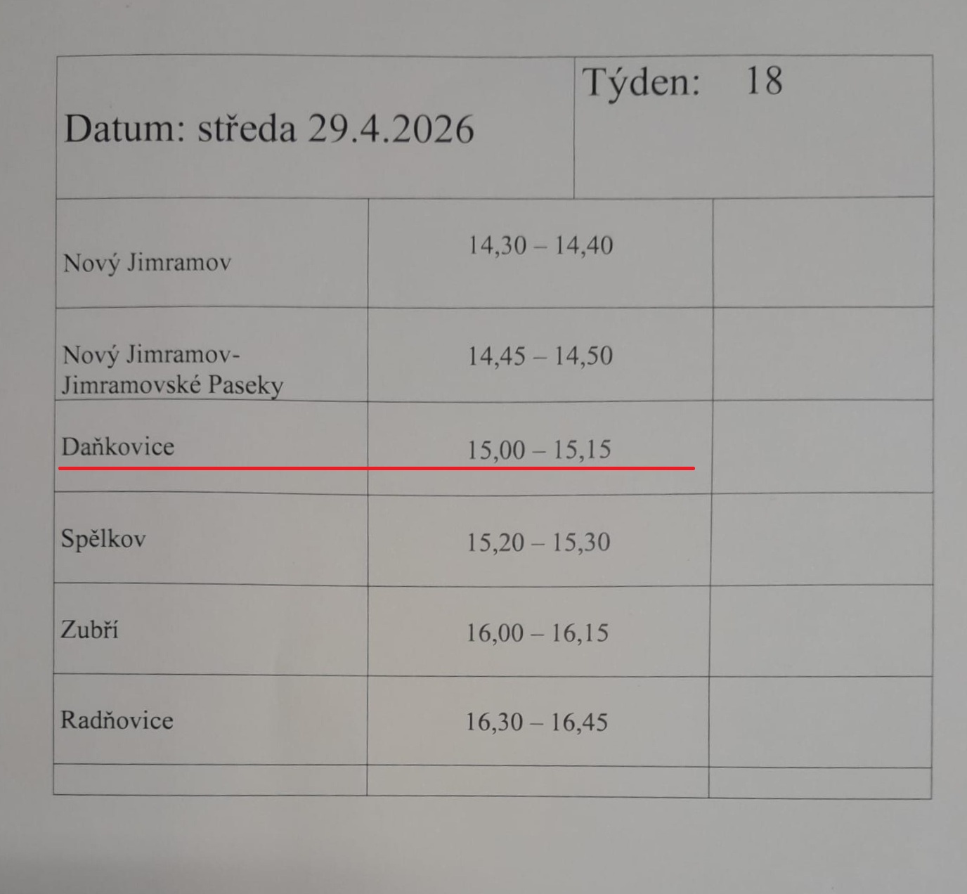 Svoz nebezpečného odpadu proběhne ve středu 29.4.2026 v 15:00 - 15:15 hodin u autobusové zastávky.